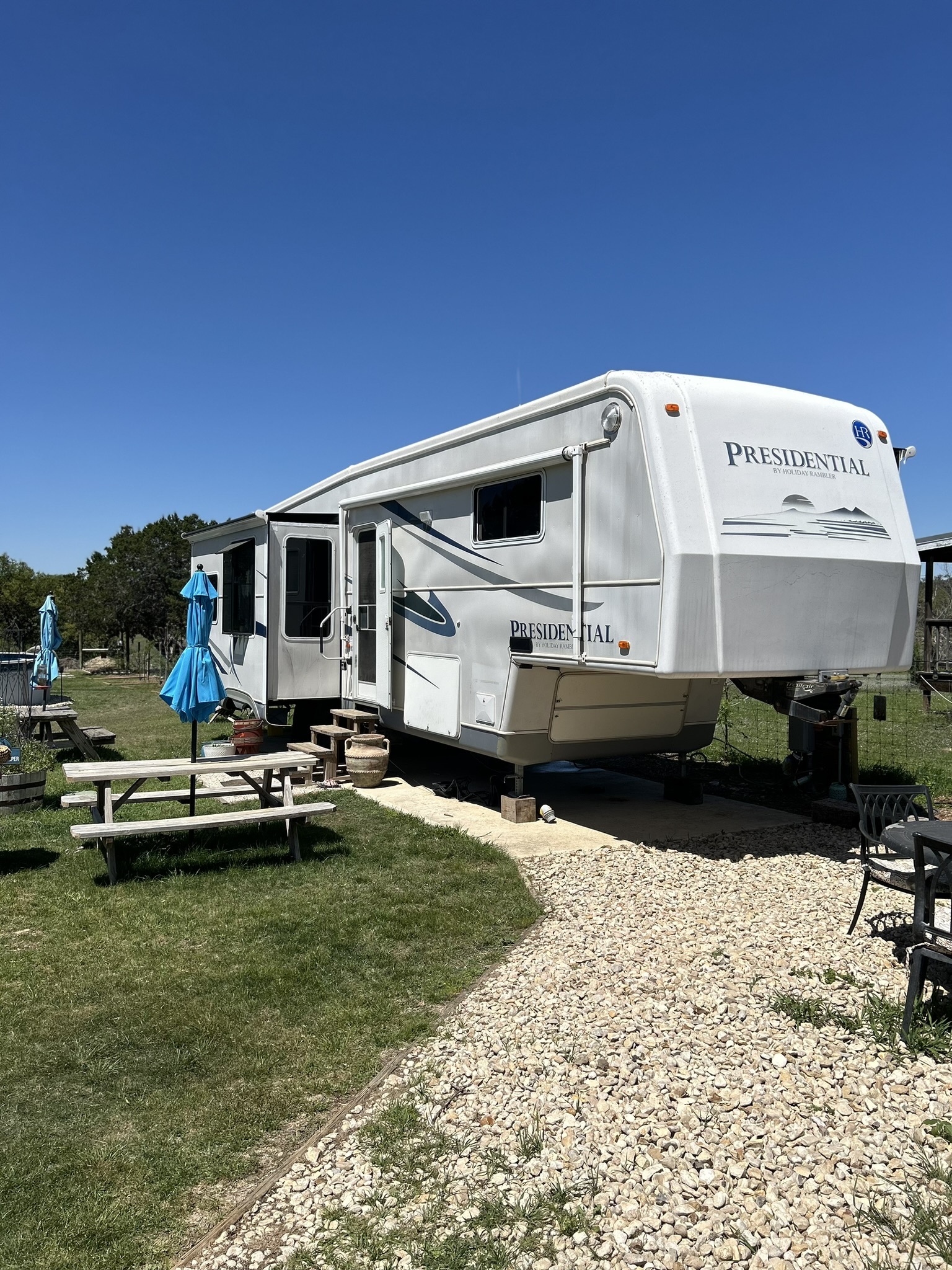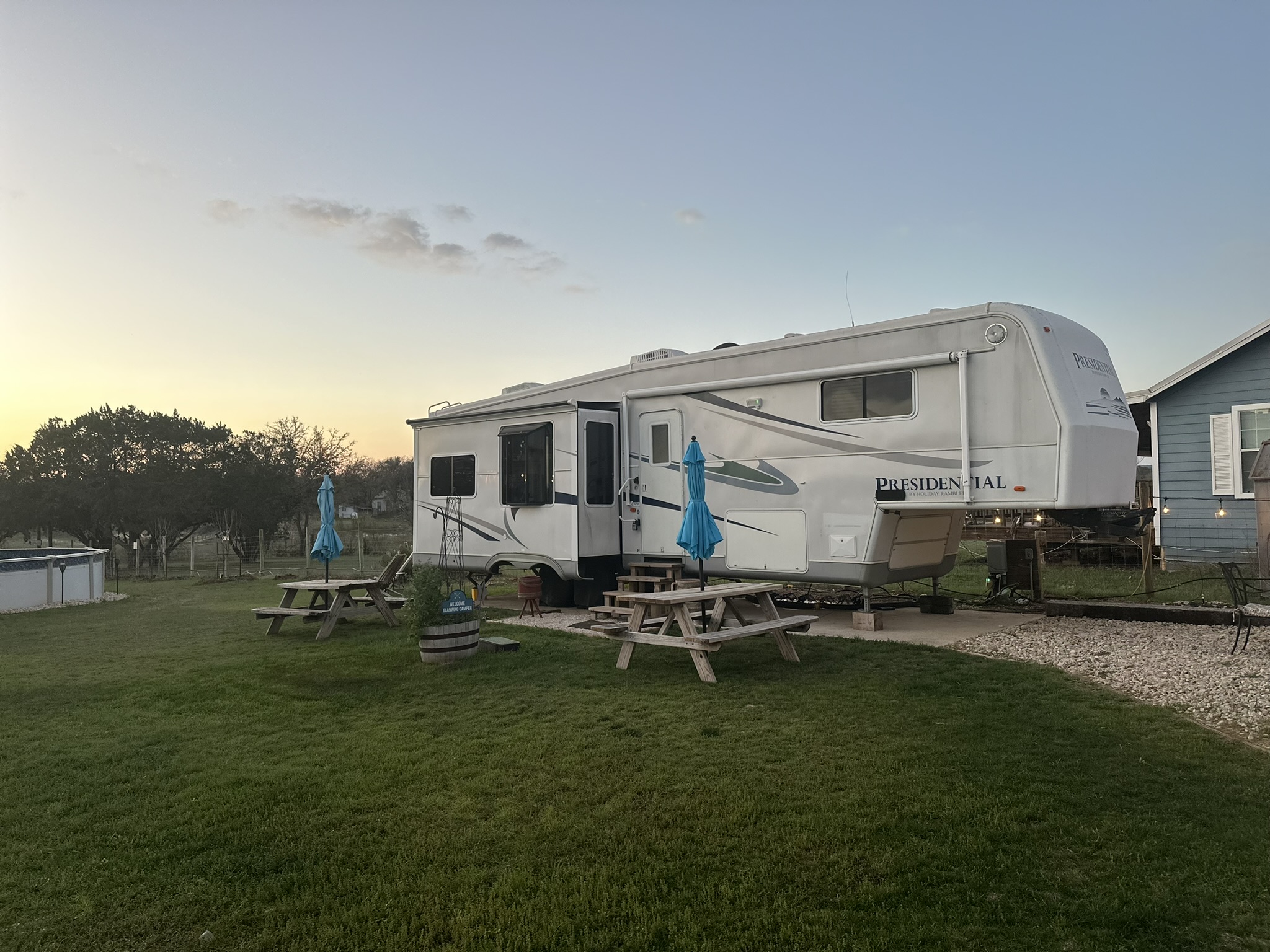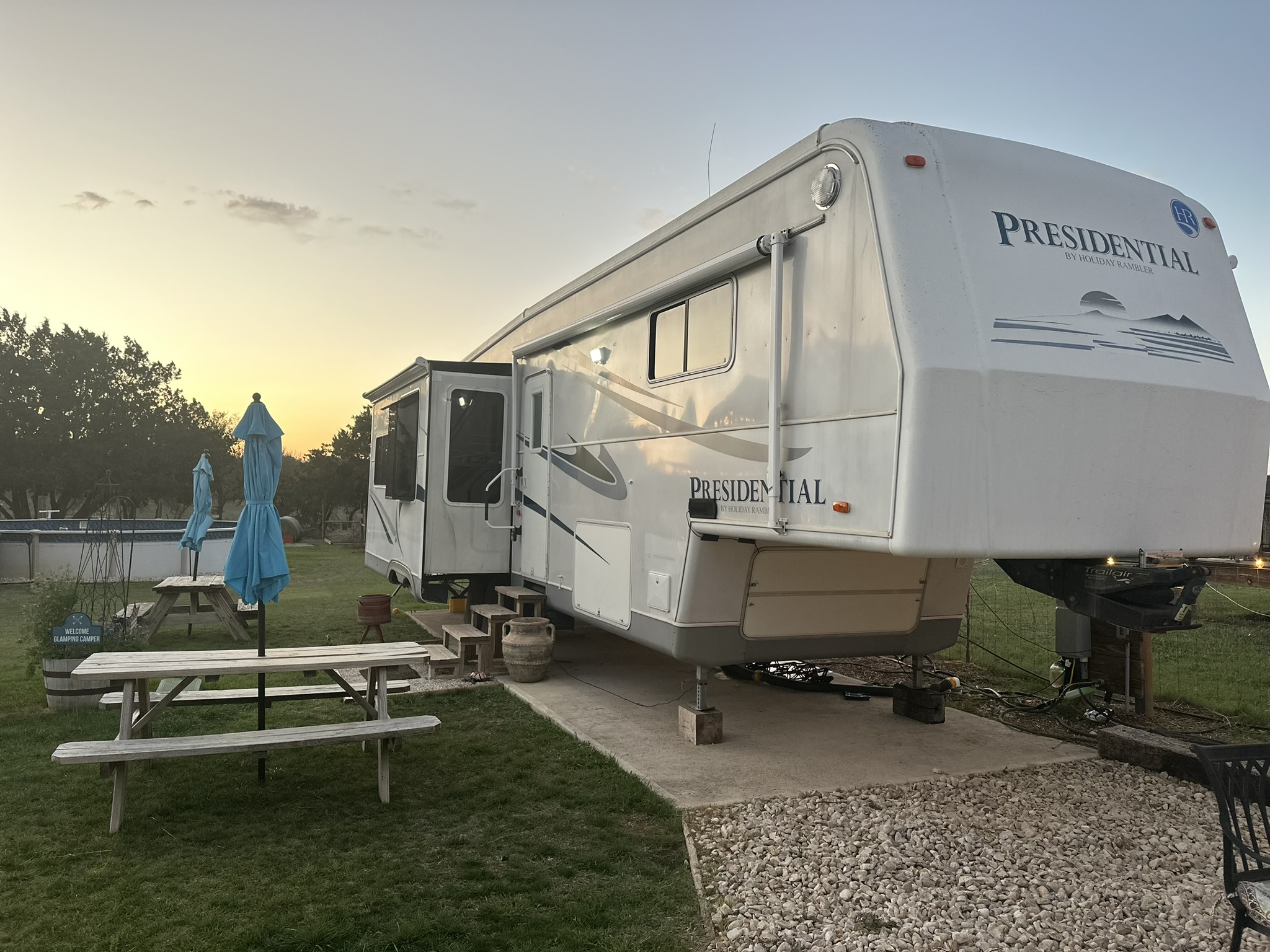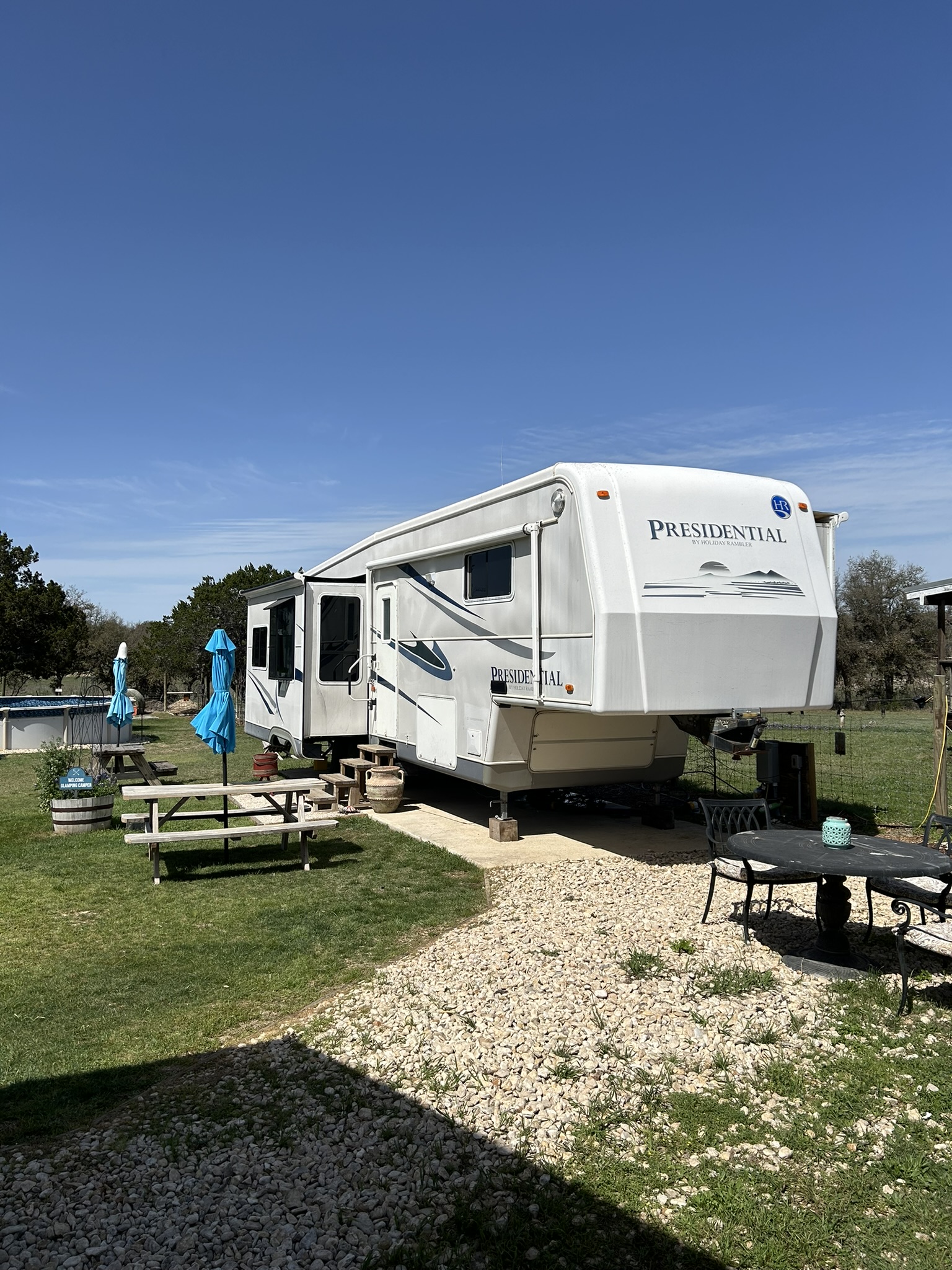 Welcome to The Suite Spot, a Mediterranean-inspired retreat located at the gateway to the Texas Hill Country in Bandera, Texas—the “Cowboy Capital of the World.” Nestled on 1+ acres of serene landscape, our 37-foot Holiday Rambler Fifth Wheel RV offers a unique blend of comfort and rustic charm. With year-round vegetable gardens, egg-laying hens, and an inviting above-ground swimming pool complete with firepits, you’ll find the perfect space to unwind and recharge.