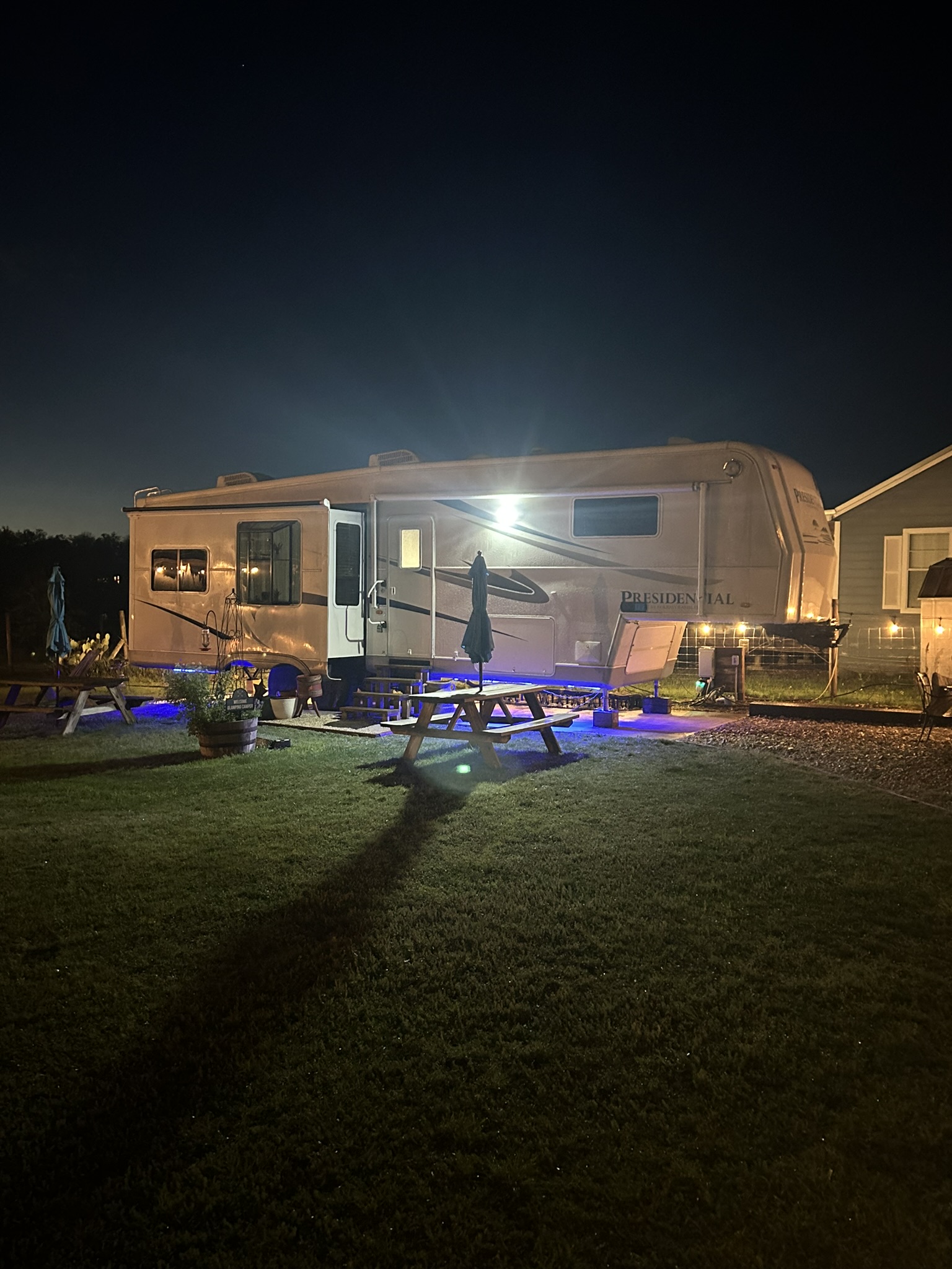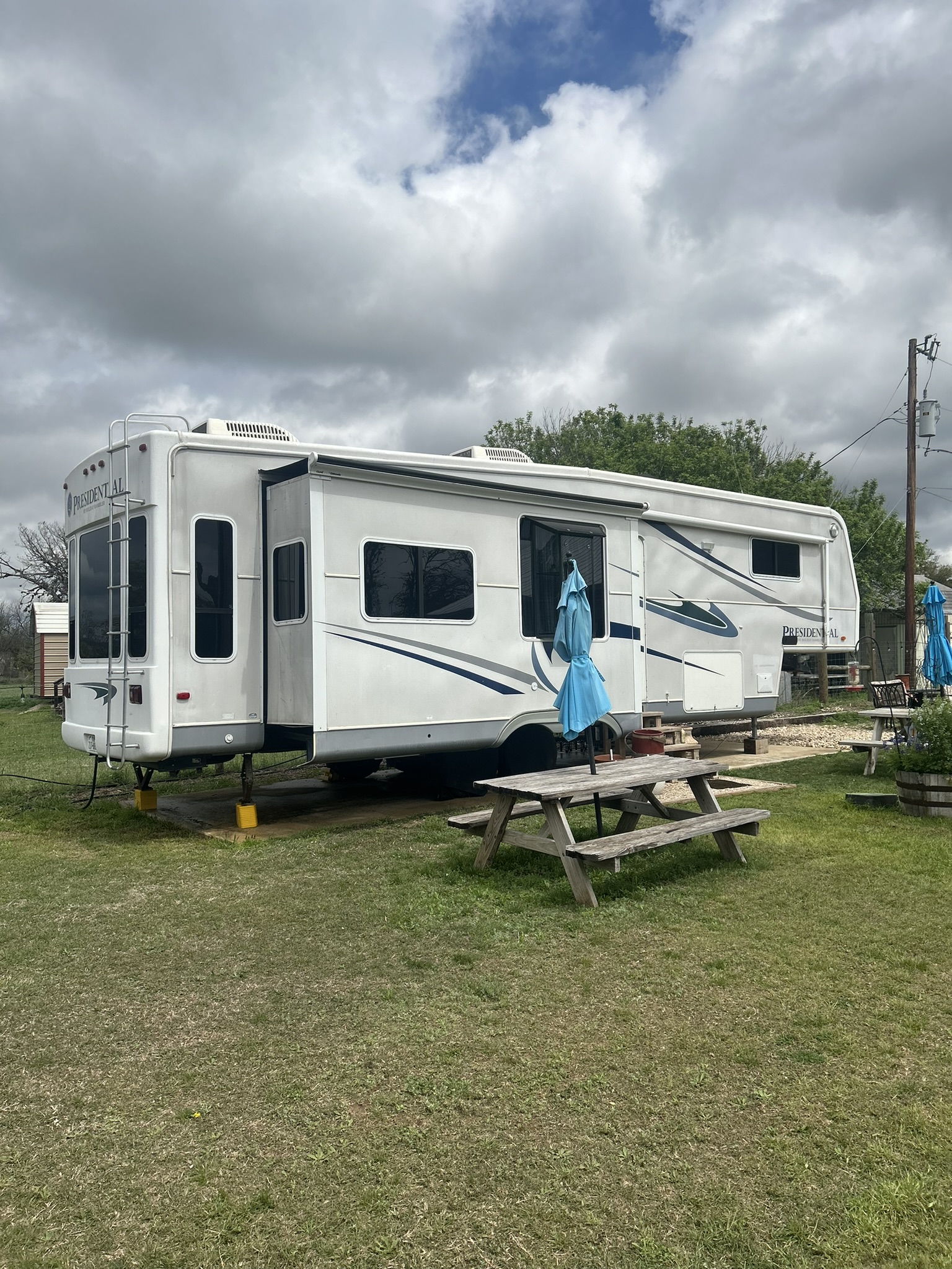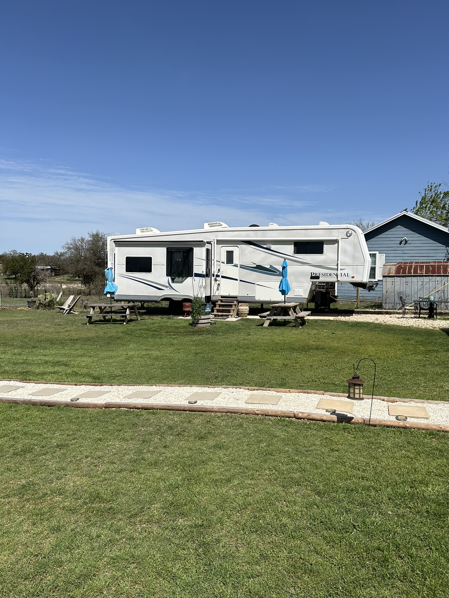 Inside, the RV is thoughtfully designed with a spacious living area, Roku TVs, leather love seats, and a full-size refrigerator. The king-size bed promises a restful night’s sleep, and the outdoor picnic areas are perfect for soaking in the breathtaking sunrises and sunsets. Whether you’re here to relax, explore, or work remotely with our superb internet, The Suite Spot is your home away from home in the heart of Texas Hill Country.