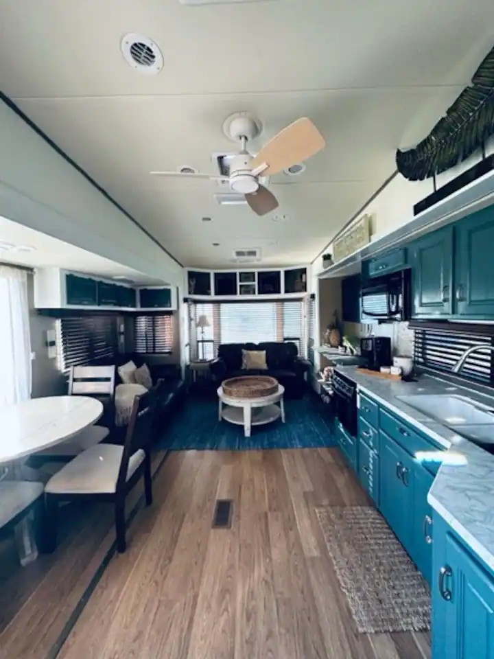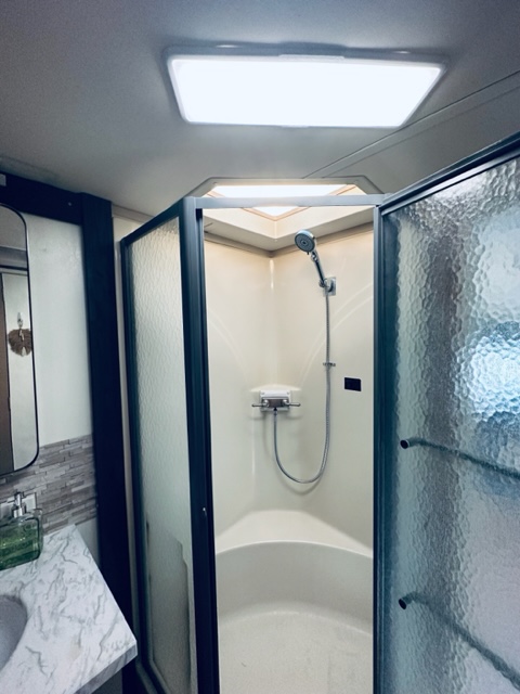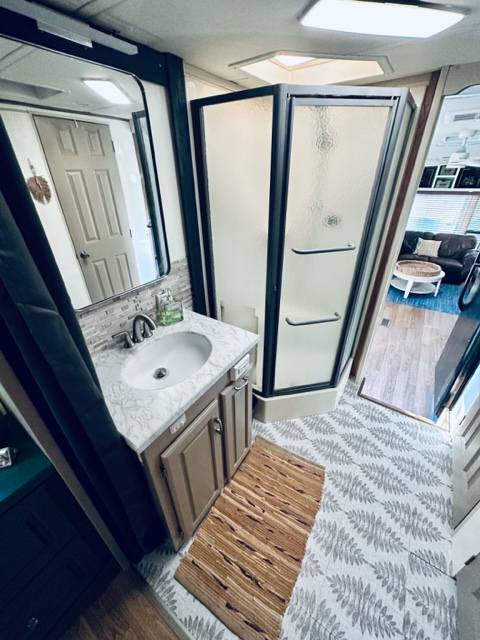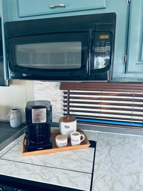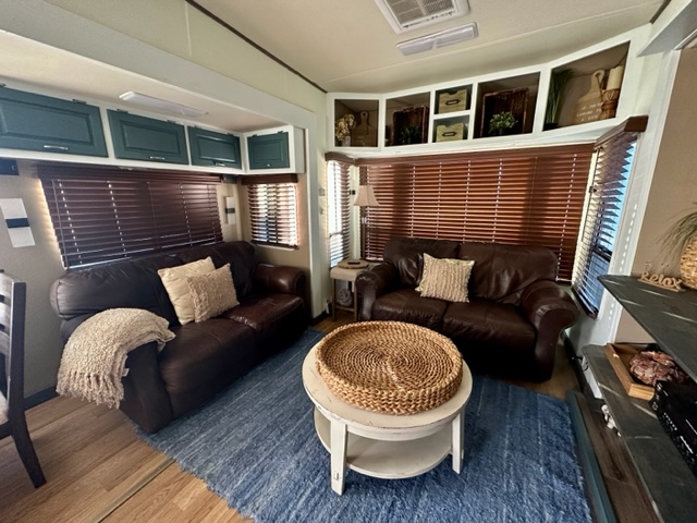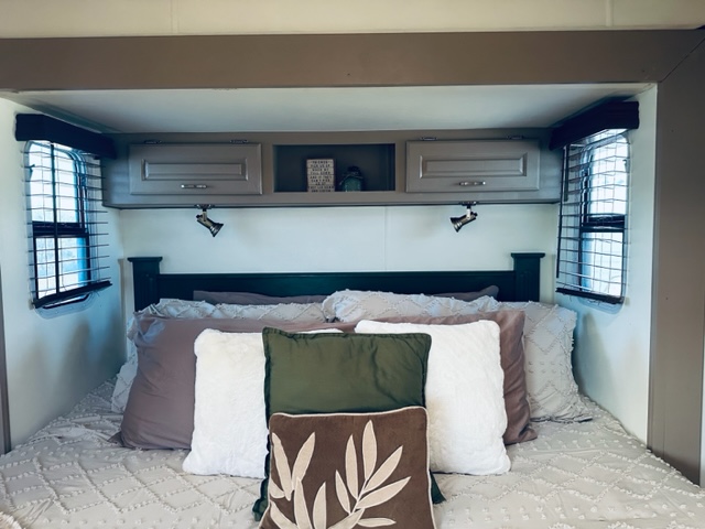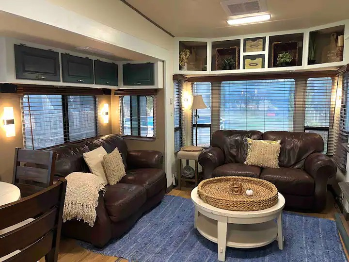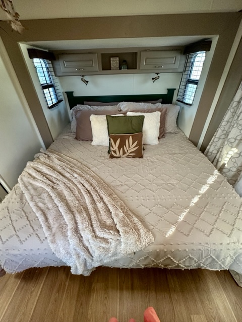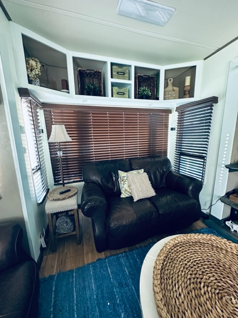 Inside, the RV is thoughtfully designed with a spacious living area, Roku TVs, leather love seats, and a full-size refrigerator. The king-size bed promises a restful night’s sleep, and the outdoor picnic areas are perfect for soaking in the breathtaking sunrises and sunsets. Whether you’re here to relax, explore, or work remotely with our superb internet, The Suite Spot is your home away from home in the heart of Texas Hill Country.